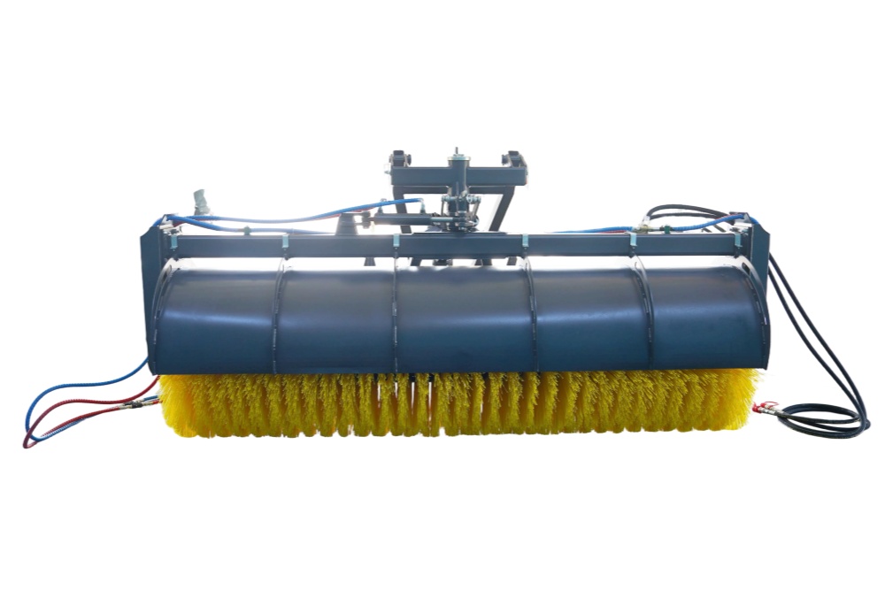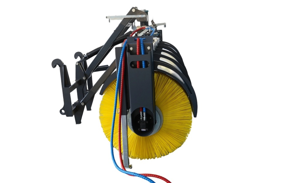- Um der Kehrmaschine mehr Drehmoment und mehr Leistung zu verleihen, kann die gesamte Kehrmaschine hydraulisch um 30 Grad gedreht werden, um Kies und Schmutz zur Seite zu fegen.